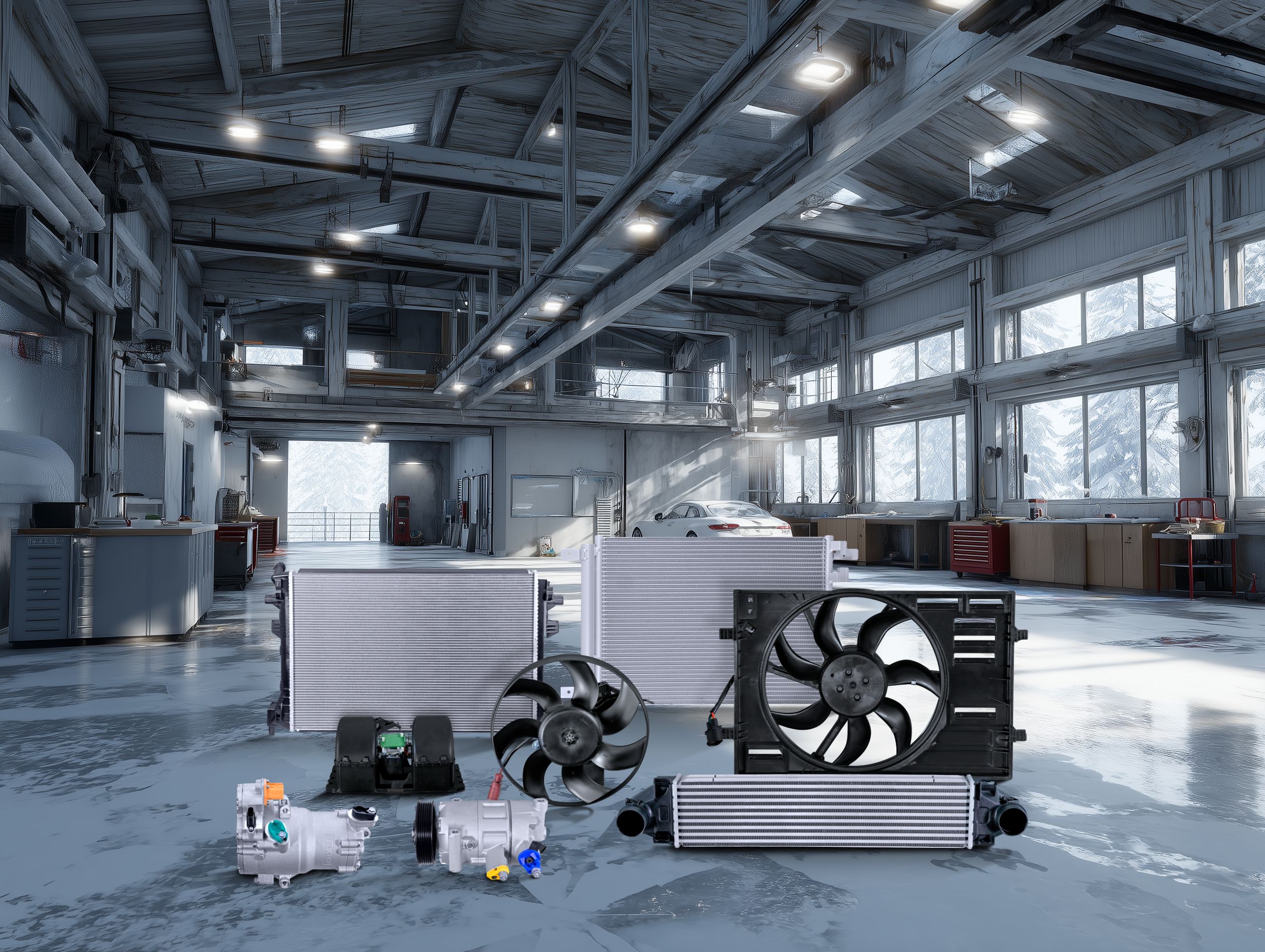 Bereit für den Einsatz in der Werkstatt: das HELLA Thermomanagement-Portfolio mit rund 1.200 Ersatzteilen. (Bild: FORVIA HELLA)