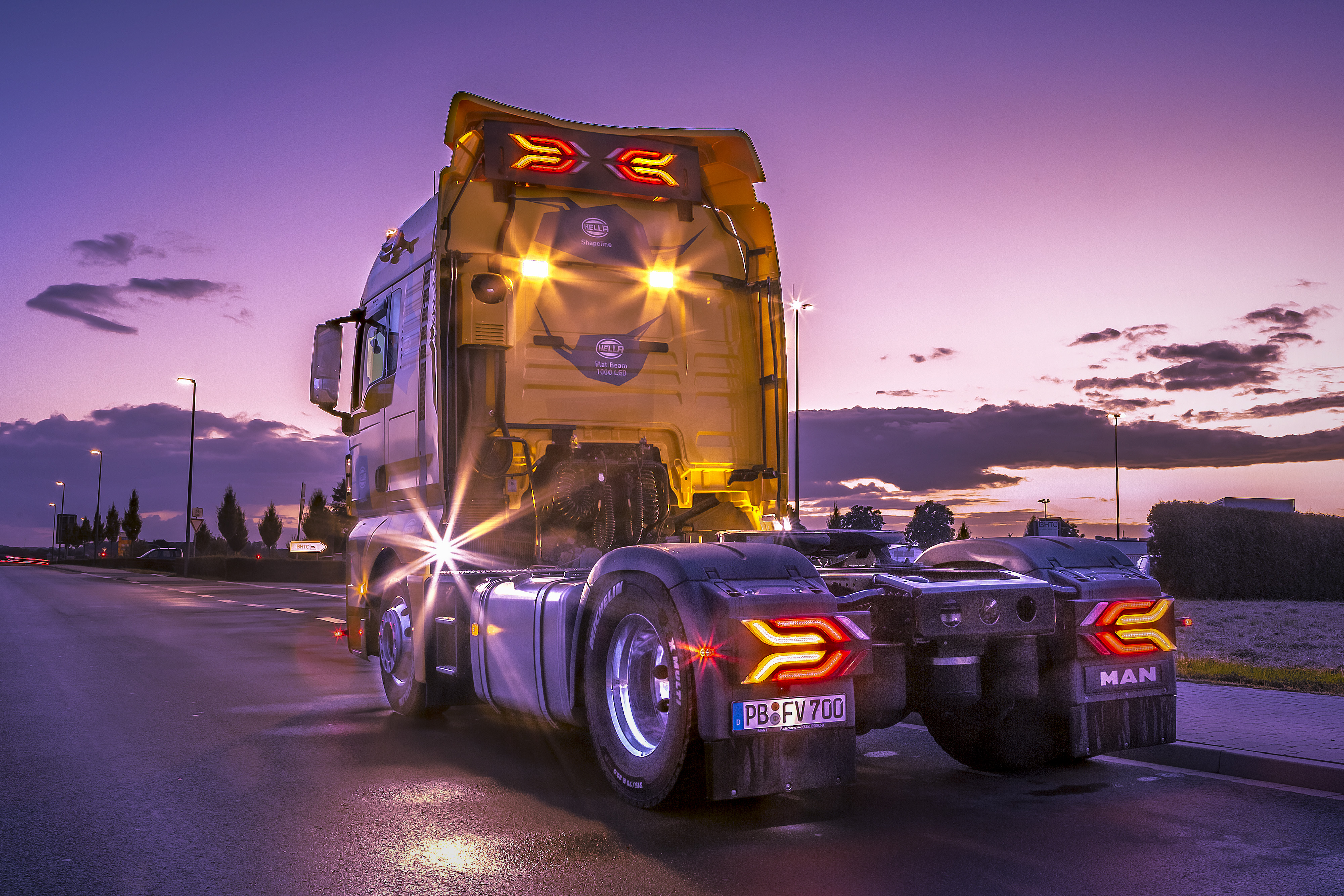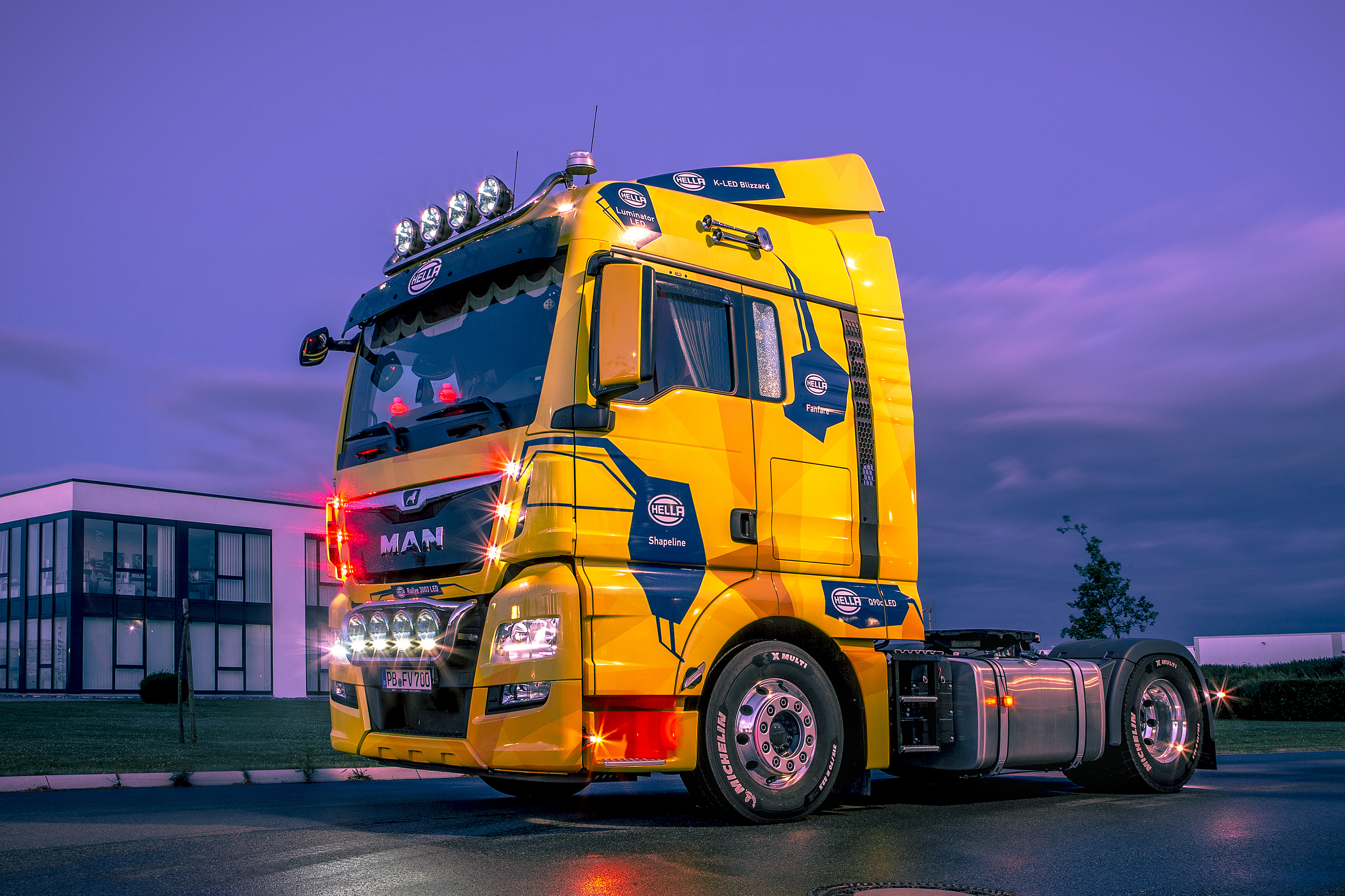 Schon von Weitem ist die Zugmaschine zu erkennen: die Fahrerkabine leuchtet in der HELLA Markenfarbe Gelb; blaue Sprechblasen deuten auf die einzelnen Scheinwerfer und Funktionen hin. Highlight sind die Shapeline-Leuchten, die für ein einzigartiges Erscheinungsbild der Zugmaschine sorgen. Mit der modularen Leuchten-Baureihe lassen sich Lichtsysteme nach dem Baukastenprinzip zusammenstellen. Dafür stehen zwei Varianten, Tech und Style, zur Verfügung. Die Beleuchtung der Zugmaschine ist komplett im Style-Design umgesetzt. Im Heckbereich realisieren die Leuchten das Heck-, Rückfahr- und Nebelschlusslicht. Dazu sind insgesamt sechs Module angebracht. Das erzeugt eine individuelle Lichtsignatur.