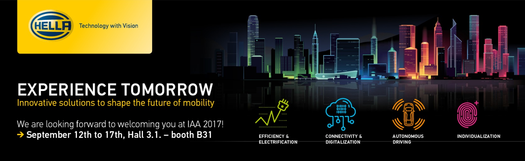 Visit HELLA at the IAA from September 12th to 17th, 2017, and experience the technologies of tomorrow in Hall 3.1, Booth B31.