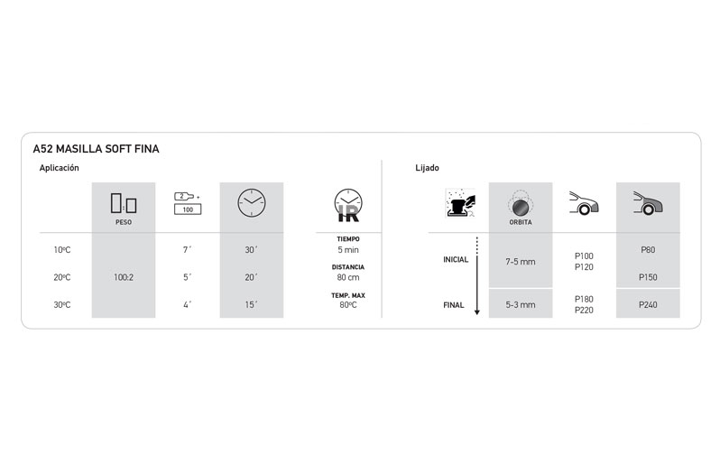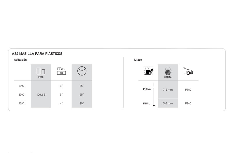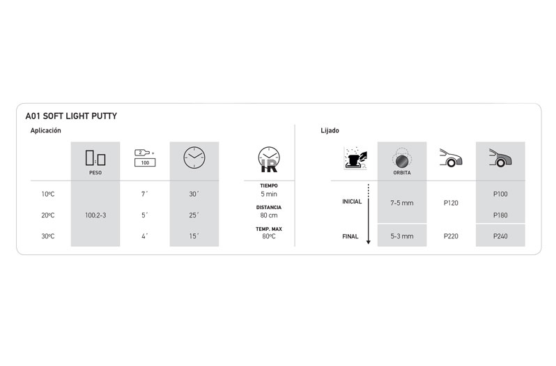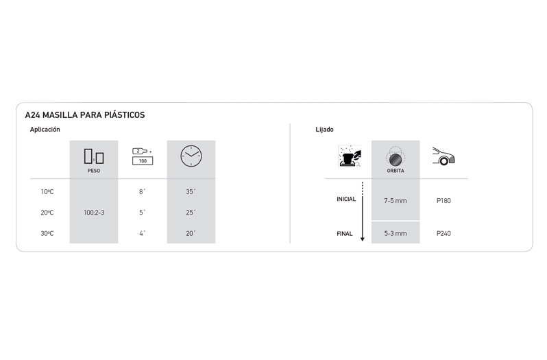 Polyester-based filler. Its special formulation and manufacturing process give it a high thixotropy, which allows it to be used for both fillers and finishes. It is easy to apply, quick drying and excellent to sand.
