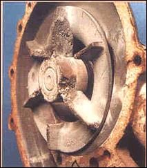 Damage to the vane by the forming and collapsing of vapour bubbles in the coolant (Figure 3)