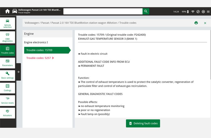 In unserem Fallbeispiel werden die Fehlercodes 15709 und 5257 angezeigt die auf einen Fehler des Abgastemperatursensors 3 hinweisen.