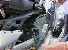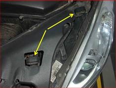 Løsn forlygten fra motorrummet, træk i den forbindelse låsestifterne (fig. 2) op, og træk forlygten frem og ud af karosseriet (fig. 3).
