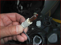 Tag afdækningen/beskyttelseshætten til bliklyspæren af på bagsiden af forlygten, og træk pærefatningen (fig. 4) ud. Udskift derefter pæren HY21W (fig. 5), tryk den let ind i pærefatningen samtidigt med at dreje den.
