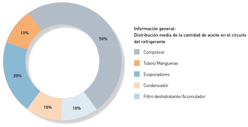 En cada componente del sistema de aire acondicionado hay aceite de refrigerante. Cuando se realiza una reparación, el aceite se elimina al sustituir el componente. Por ello, es absolutamente imprescindible volver a rellenar la cantidad de aceite correspondiente. El gráfico adjunto muestra la distribución media de la cantidad de aceite dentro del sistema.