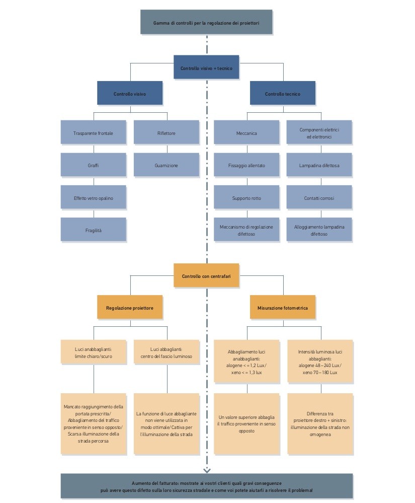 Di fatto i centrafari simulano la parete a 10 metri di distanza. La lente montata nella scatola ottica riduce il tratto di misurazione prescritto da 10 metri a 50 cm (dalla lente allo schermo di controllo, vedere la figura 2).
